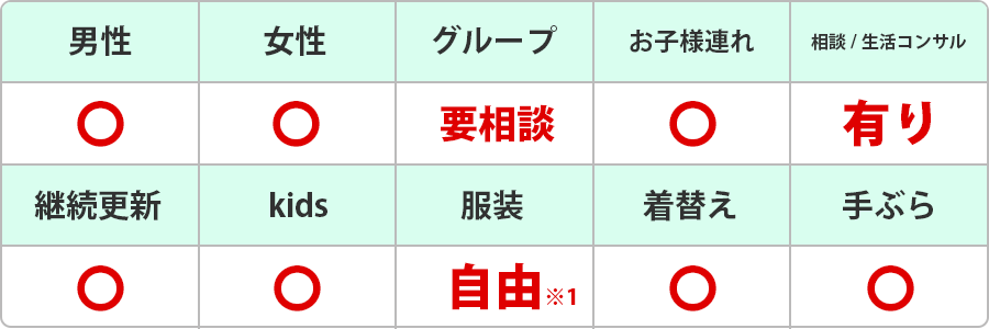 ※1 但しスカートは不可。着替えを持参していただければ大丈夫です。